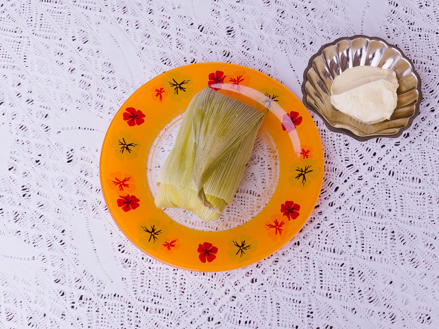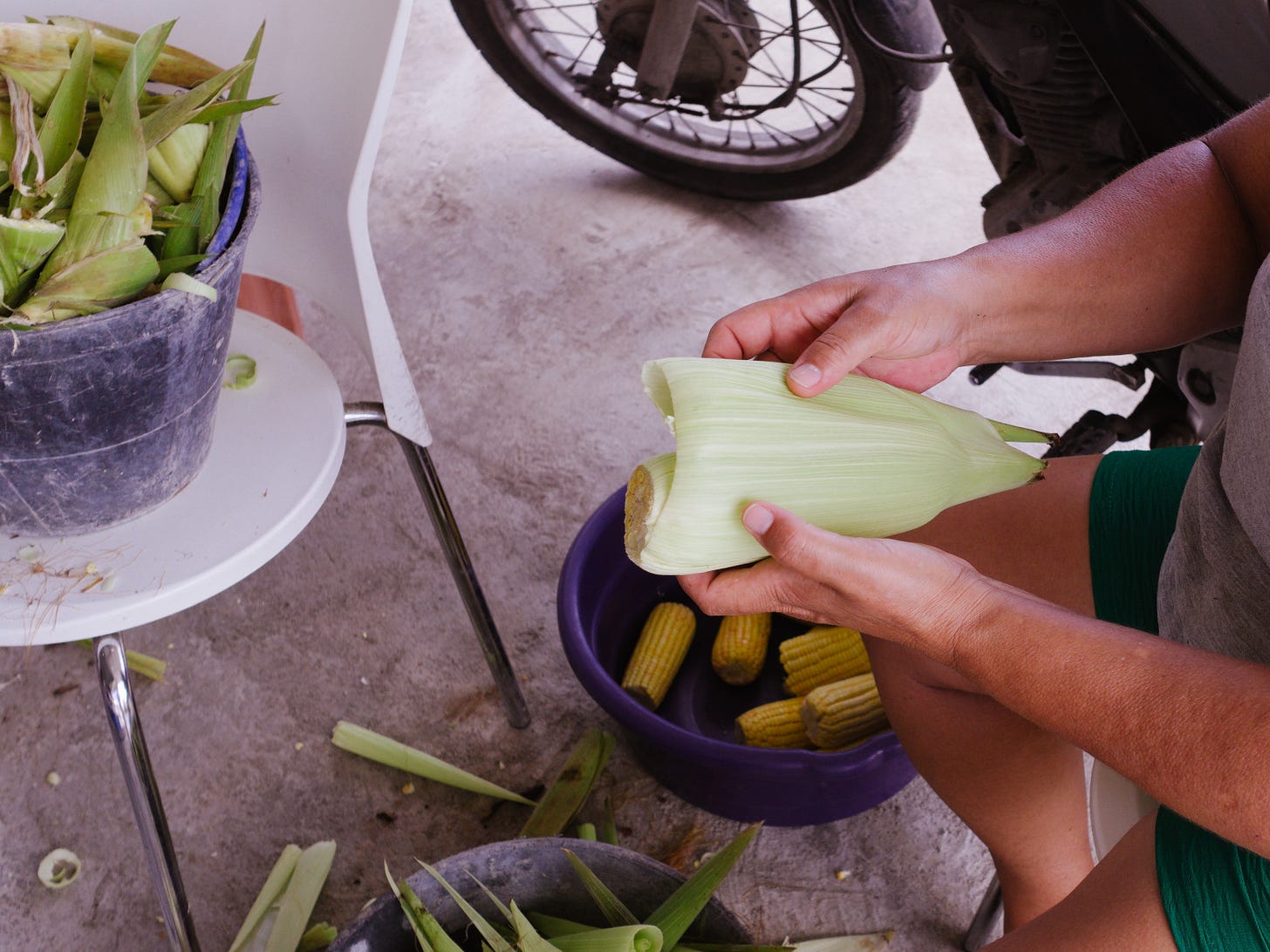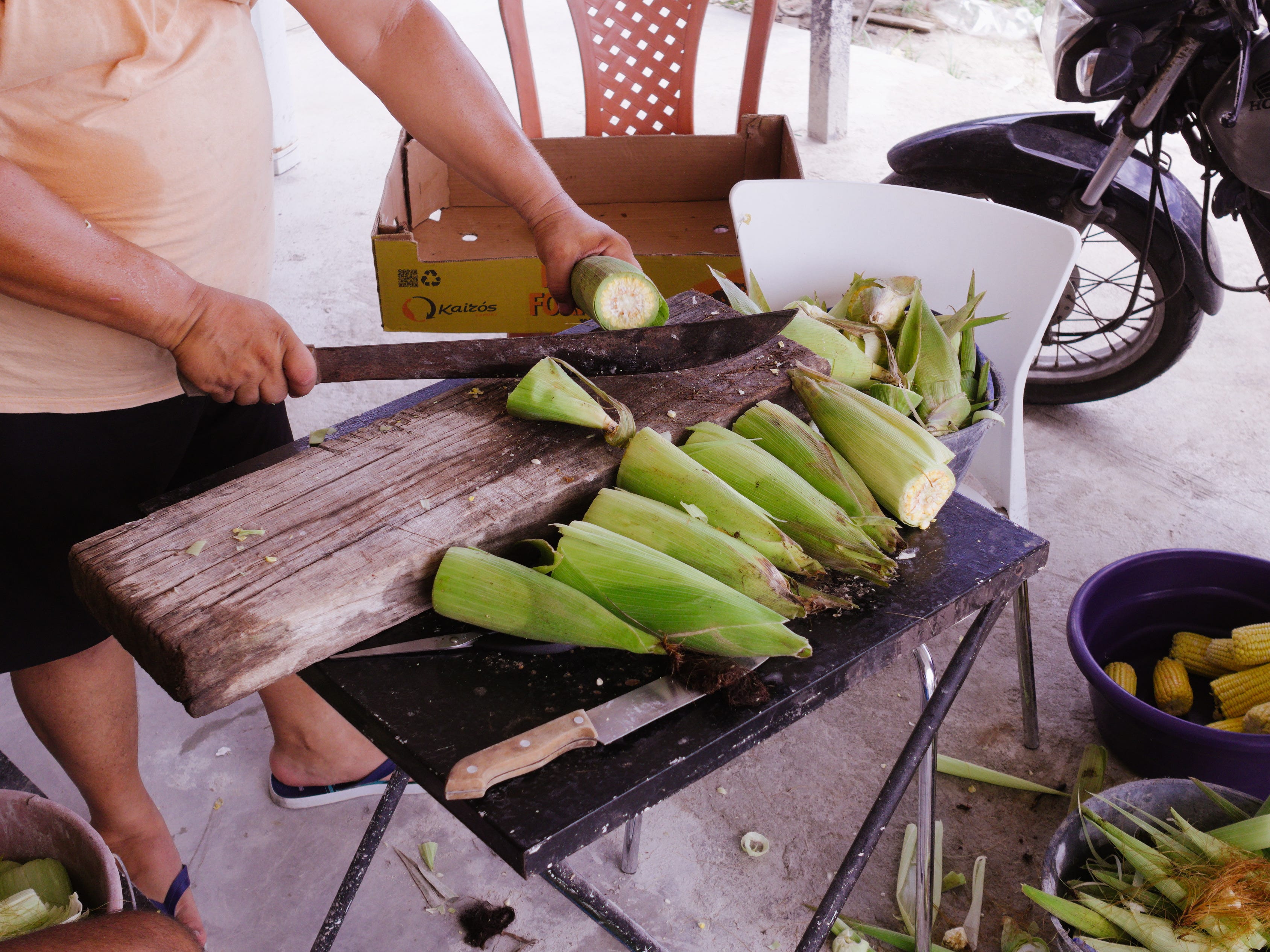 Only the largest and most flawless husk layers are kept for filling and the rest can be discarded. Then we washed the corn cobs and blanched the husks in boiling water to sanitise them. Rosania then showed me how to grate the corn on a large metal grater that her husband made. This is one of the key steps I will later test with cheese graters and food processors so you all can achieve a similar batter texture at home. After grating, Rosania pressed and slid the dull edge of a knife along each cob to extract any remaining juice and corn flesh.