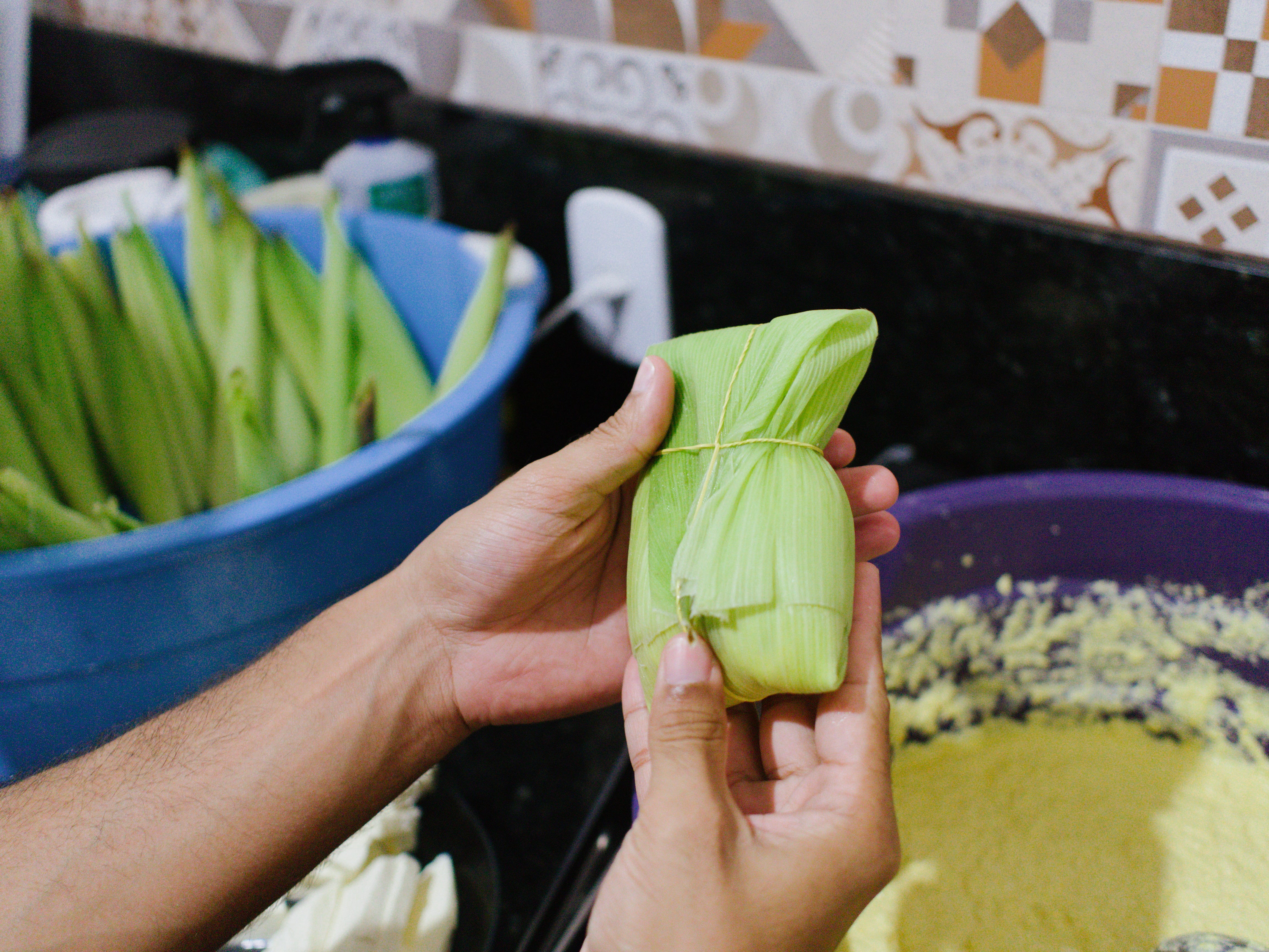 Now that we had our bowl of juicy, grated corn, all Rosania added was salt (to taste) and very hot oil until the texture became more homogenous and the mixture tasted just slightly cooked. Now the crafty part began, when we folded, filled and tied each pamonha to prepare them for boiling.
