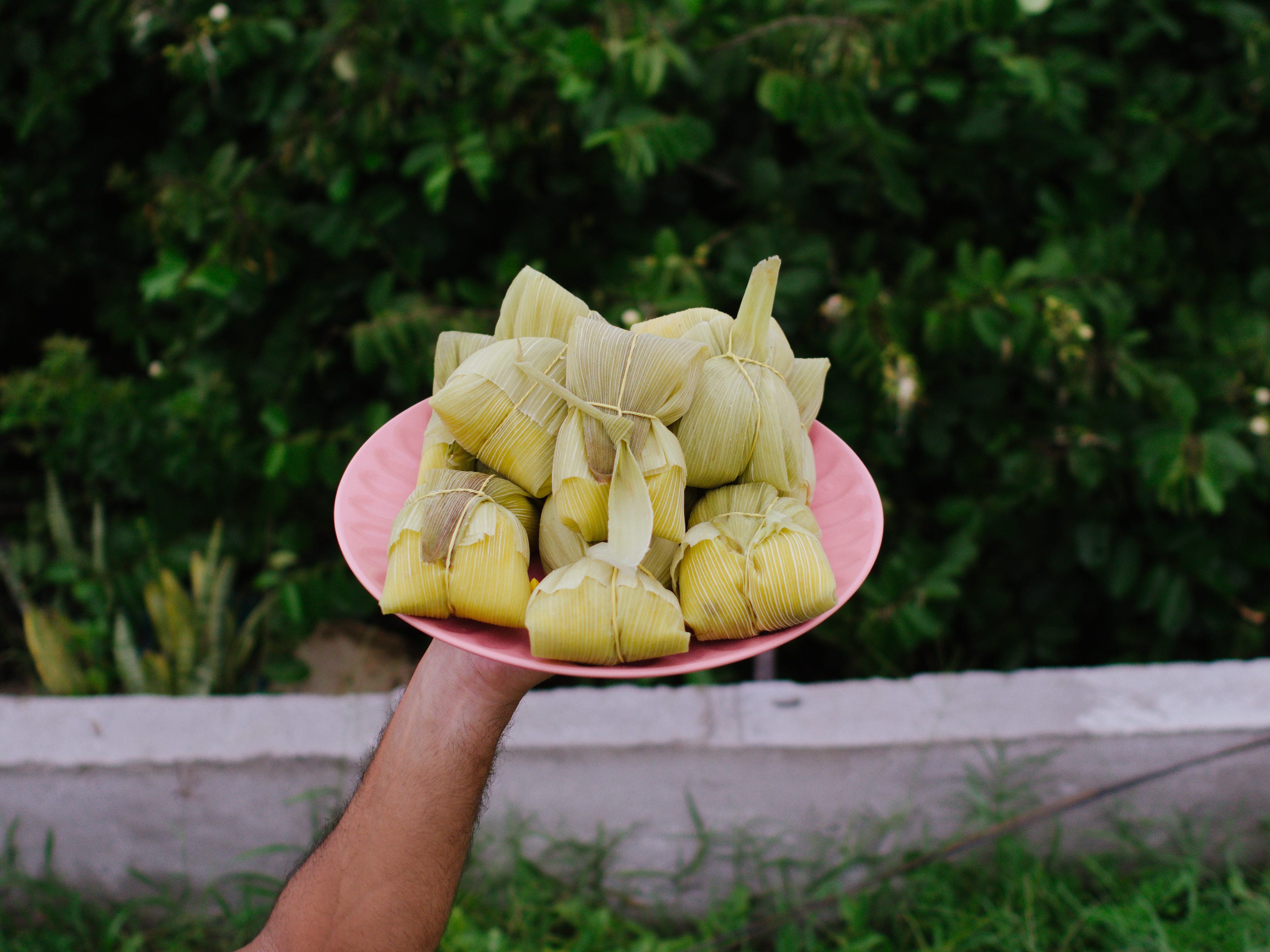 If you’ve made or eaten tamales before, you’ll notice the process and ingredients are familiar. Whereas tamales are made with masa harina, which is the dried product of corn that has been soaked in limewater, these pamonha are made with fresh grated corn. Tamales are turned into a dough by adding water to the dry ‘flour’, along with water or stock and various seasonings. Pamonha is more like batter, wet enough to be scooped into the corn husks. I draw the comparison because it helped me make sense of the logic and cooking technique. My thinking of pamonha as comparable to tamales led to my eating them with typical tamale companions—beans, tomato salsa, cilantro—much to the confusion of João’s family.